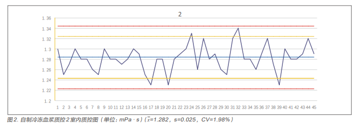 先将SA-7000血流变仪进行日常的维护、清洗和保养, 对血浆黏度做定标校准,取上述两份分别编号为质控1和质 控2的自制冷冻新鲜血浆各5mL,二者各重复测定20次,经 过统计学处理,分别计算出它们的均值x及标准差s,作为 各自的靶值及靶值范围。随后每天取自制冷冻血浆质控1和 质控2各一支,置于37˚C水浴箱中温浴约15min,使其复溶 后立即取出。然后二者与当天常规标本一同检测得出结果并 记录。自制室内质控连续开展45个工作日并同时绘制质控 图表,观察分析结果。
